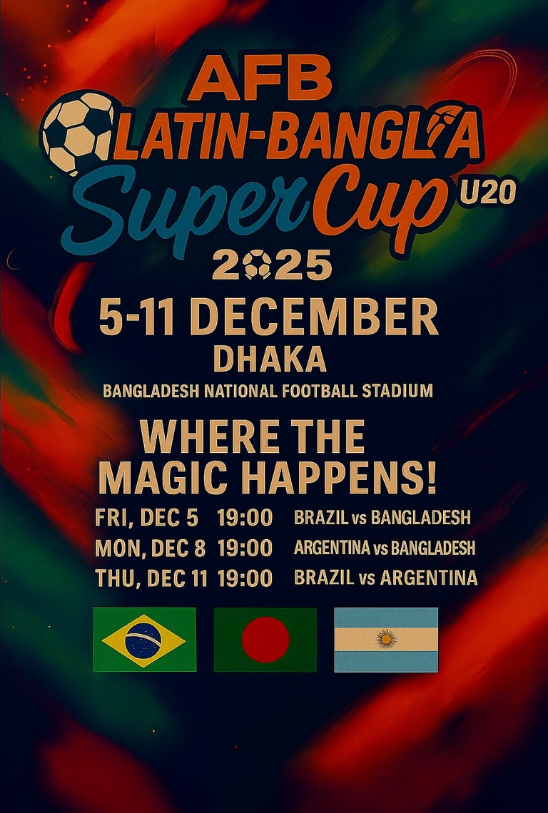 Entre os dias 05 e 11 de Dezembro de 2025 está sendo realizada na Capital Dhaka a Latin-Bangla Super Cup, que é um torneio envolvendo um time que representa Bangladesh, um selecionado Brasileiro e também um selecionado Argentino de futebol.